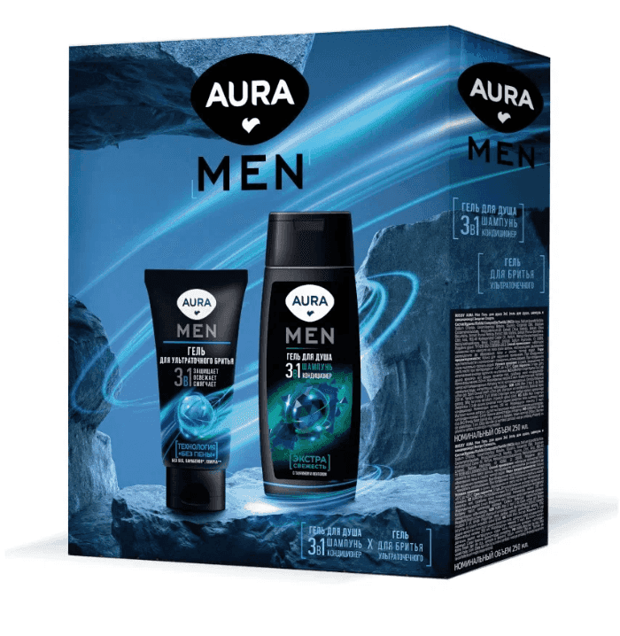 AURA MEN Подарочный набор, гель для душа Экстра свежесть 250мл + гель для бритья 150мл