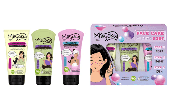 MIRYOKU набор FACE 3STEPS: пенка для умывания 50мл + пилинг-скатка для лица + крем для лица
