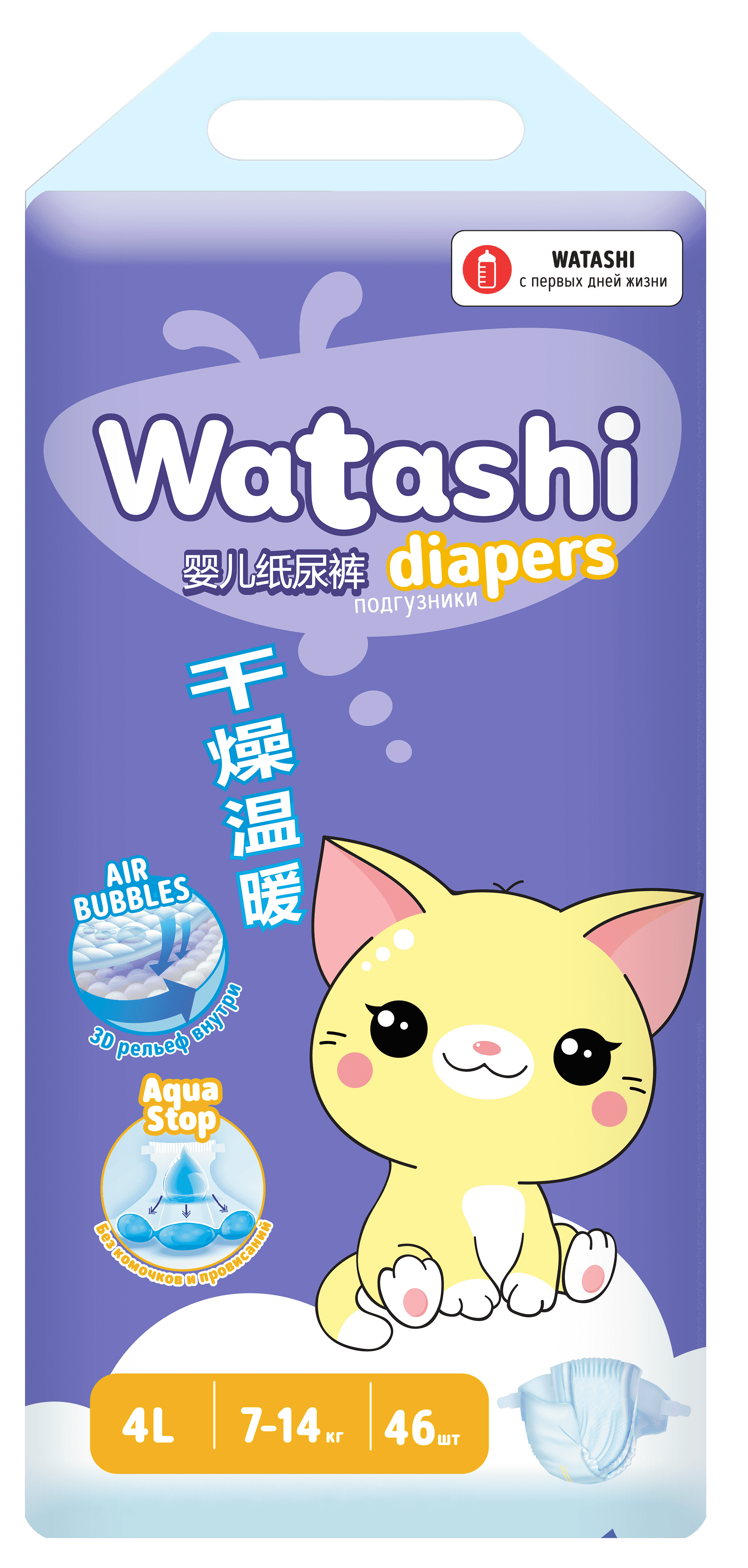 WATASHI Подгузники одноразовые для детей 4/L 7-14 кг jambo-pack 46шт КК/2