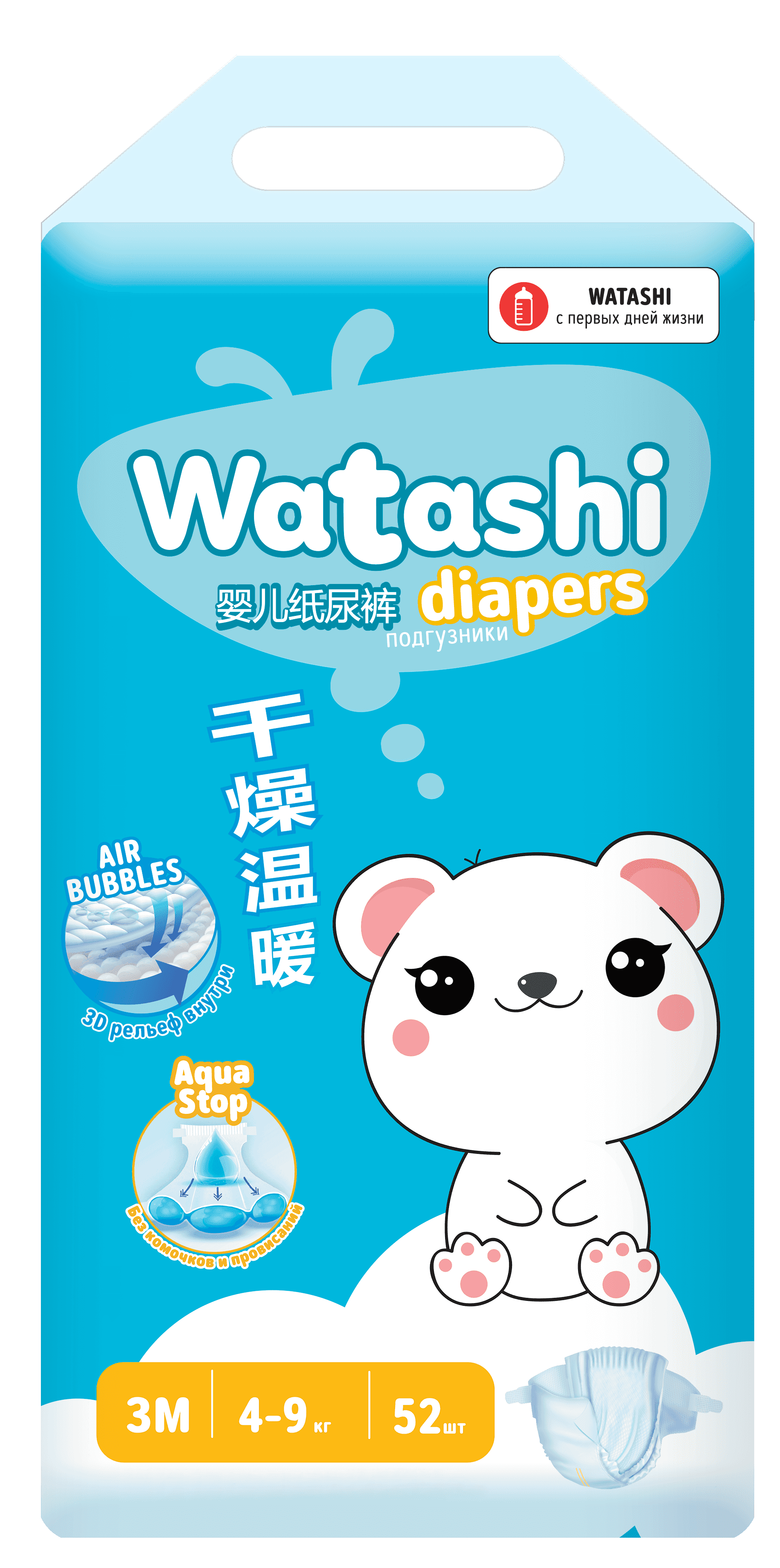 WATASHI Подгузники одноразовые для детей 3/М 4-9 кг jambo-pack 52шт КК/2