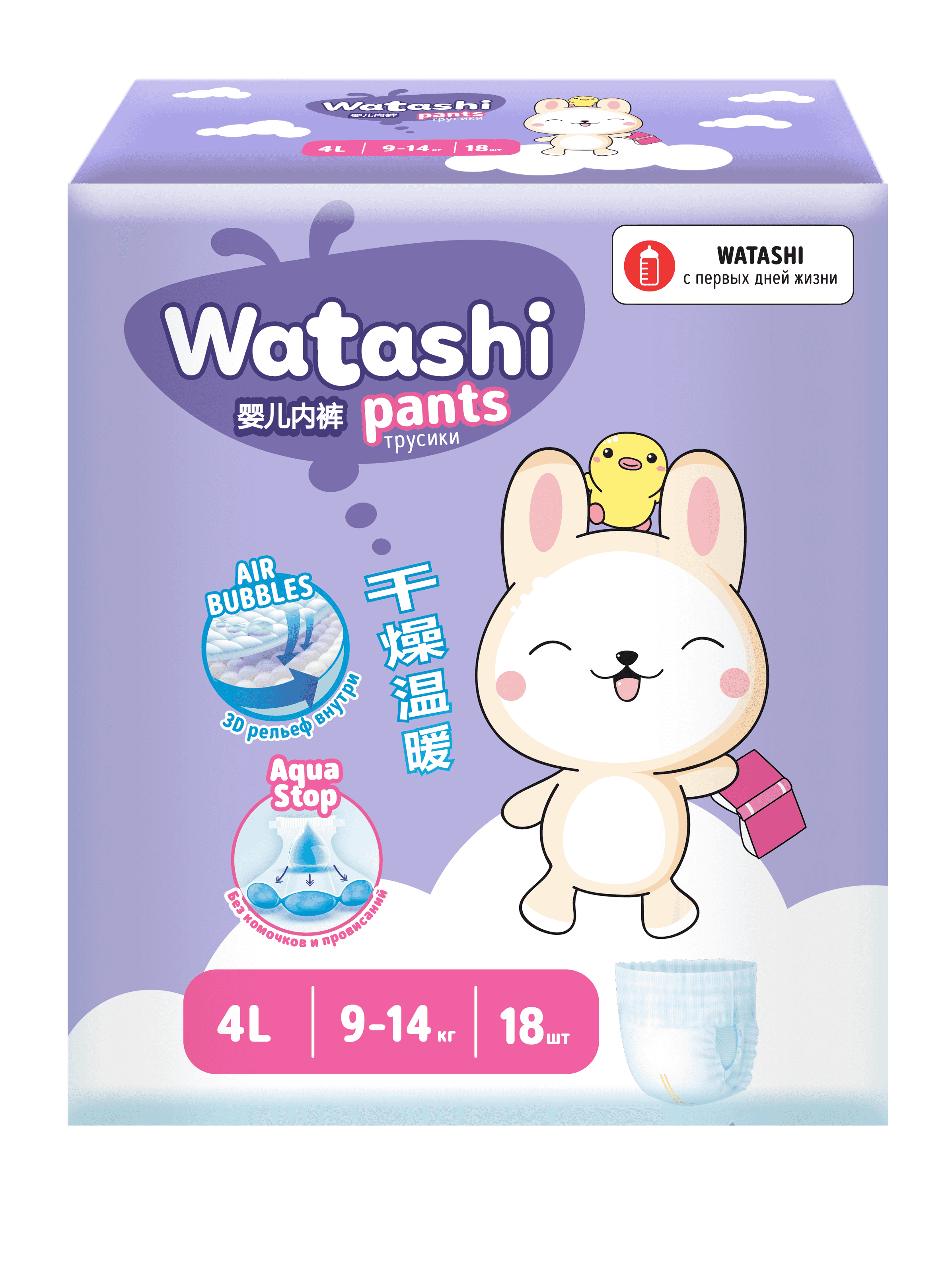 WATASHI Трусики-подгузники одноразовые для детей 4/L 9-14 кг small-pack 18шт КК/4