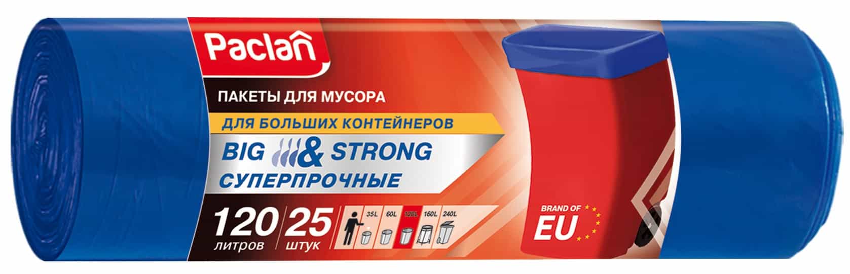 Paclan мешки для мусора Big&Strong 120 л, 70х110 см, 25 шт, 26 мкм, голубые
